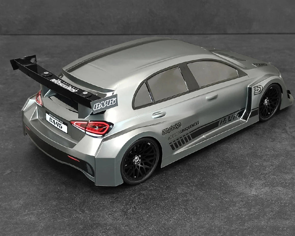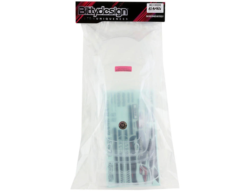 This is the Bittydesign CA45 1/10 FWD Touring Car Body. Designed with competition in mind, this performance body option is an excellent addition to the 1/10 Front Wheel Drive segment. The CA45 was inspired by full size cars giving it an ultra realistic look. Top priority was given to the bodywork in creating a realistic look while optimizing aerodynamics for the performance possible. Experience next level performance and the looks to match with the CA45 from Bittydesign.