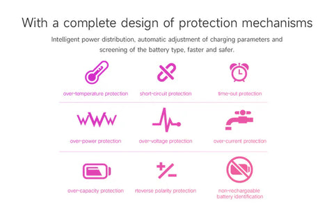 ⚡⚡【Compatible with multiple battery types】Integrated control of lithium-ion, lithium high voltage, lithium iron, nickel-metal hydride, nickel-cadmium, and nickel-zinc batteries, automatic identification of battery type, and intelligent charging algorithm matching.