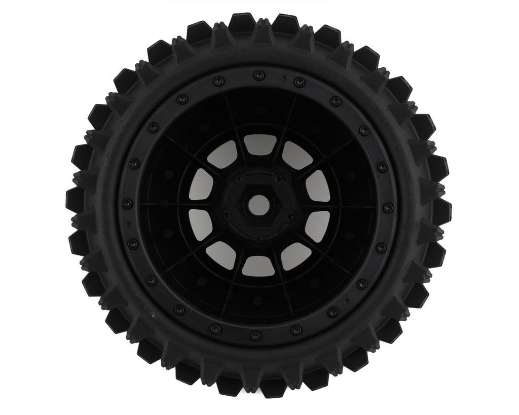 The multi-piece Hazard wheel is secured to the tire with dependable hardware via beadlock rings on the inside and out. The pre-installed hardware fits together tightly and bites through the tire bead to hold the hefty assembly in position. Two hex adaptors are included to accommodate different vehicles on the market. The installed option with 17mm hex installs directly to the popular vehicles such as the X-Maxx and XRT. The optional hex will need to be placed to fit on the Arrma Kraton 8s.