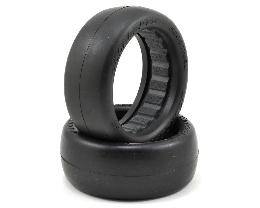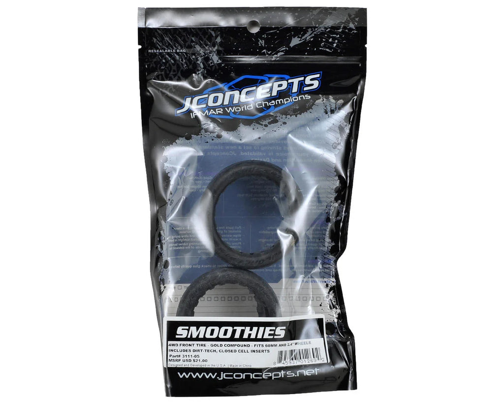 This is a pair of two JConcepts Smoothies 60mm 4wd Front Buggy Tires. JConcepts remains committed to 1/10th off-road racing by releasing the Smoothies. In some conditions in off-road racing, there is no denying that a slick tire is the fastest way around the track. Throughout the racing calendar year, there are several tracks where slicks in gold compound are the go-to tire. In damp weather, indoor clay surfaces become so tacky that the lower the tread or to the point of zero tread is an advantage. For years drivers have sanded, ground and hand sculpted tires in search of that elusive slick carcass for racing.