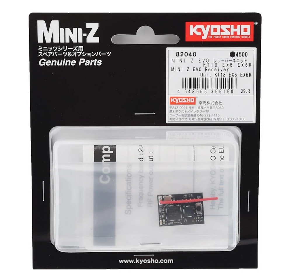 The Kyosho KT18/EX6/EX6R MINI-Z Evo Receiver Unit supports the KT-18 (ASF only), EX-6 and EX-6R (ASF and MHS) transmitters. Also supports KO Propo's EX-2 and EX-RR (MHS only).