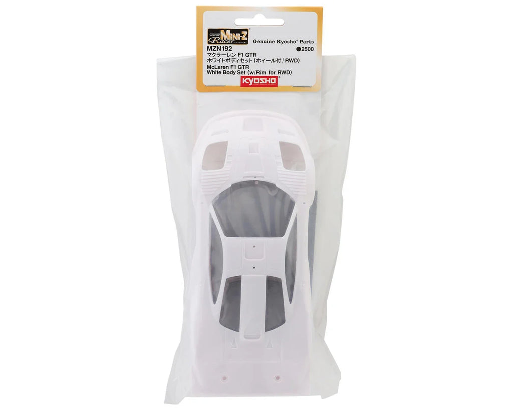 Kyosho Mini-Z MR-03 McLaren F1 GTR Body with Wheels. This is an optional body set intended for use on the Kyosho Mini-Z MR-03 RWD platform. This body and its accessories are unpainted, allowing you to add your own custom paint scheme and personalized touch.
