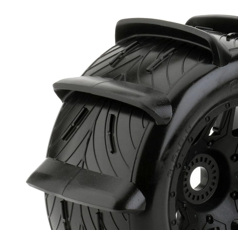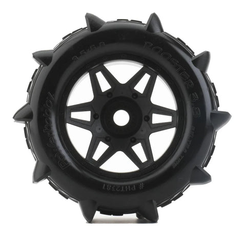 This is a pair of pre-mounted Rooster 3.8" Sand or Snow Truck Tires. These tires are belted, so no more tire ballooning. The Rooster tires provide hours of fun in the sand, snow, or even in the occasional mud pit. The eleven paddles ensure maximum performance due to the true scoop design coupled with low roll outer sidewalls.