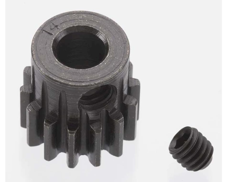 Robinson Racing Extra Hard Blackened Steel 32 Pitch Pinion gears are built to last. Made from high carbon steel and then heat treated to increase the hardness of the surface even more. High carbon steel is naturally higher in lubricity and lower in adhesion than milder grades of steel making these gears ideal for use with metal spur gears. Can be run on motors using a 5mm motor shaft including Traxxas, Associated, and HPI models or for any heavy duty application. Standard 1/8 shaft motors will require a 5mm to 1/8 inch Reducer Sleeve (RRP1200). These pinions are available in a variety of tooth count options. Choose one from the pull down menu above.