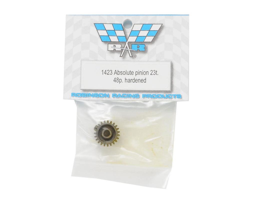 Super hard, heat treated, "Absolute" pinion gears are a must for using with steel spur gears, and will last and last if used with plastic spur gears.