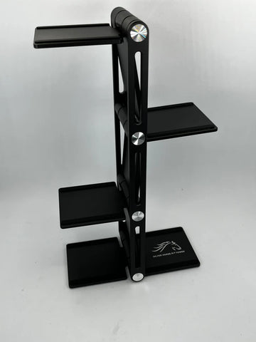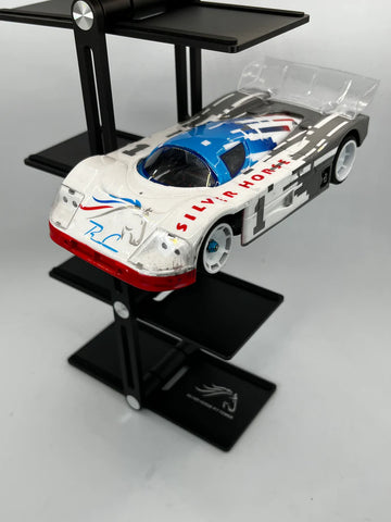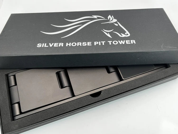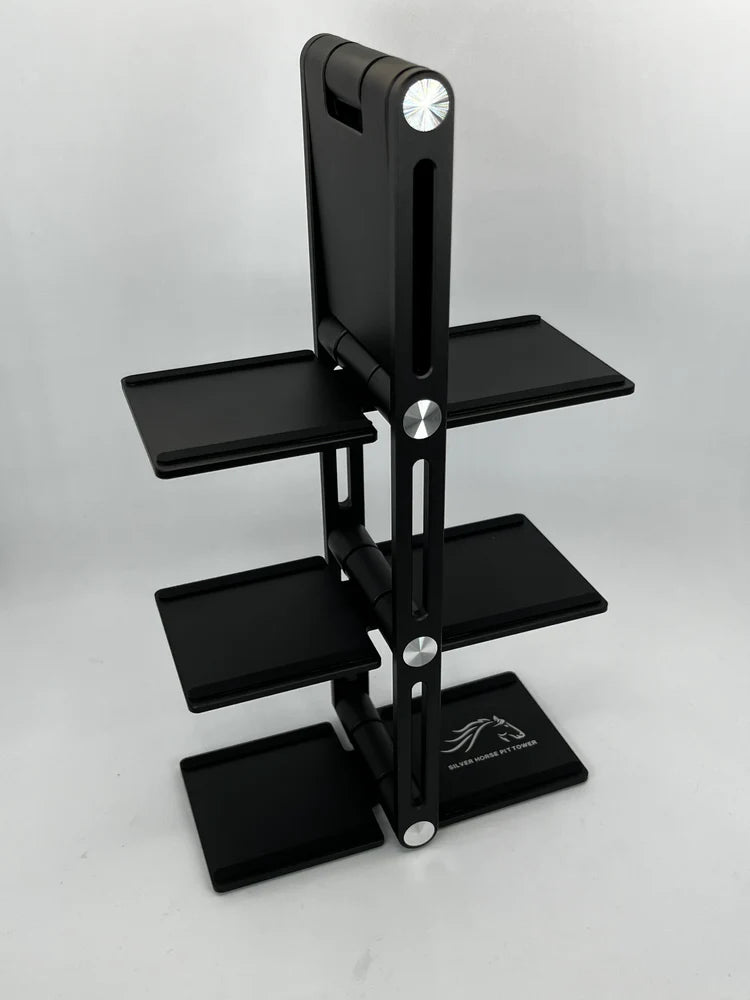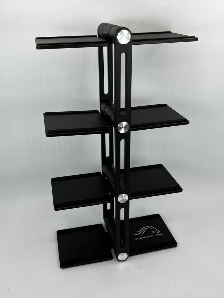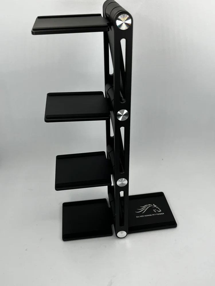 The Silver Horse RC Pit Tower revolutionizes pit space management with professional-grade design and versatility. Crafted from high-grade aluminum for durability, this elegant storage solution accommodates up to 8 cars with multiple configuration options. The tower's standout feature is its space-saving collapsible design - it folds completely flat for easy transport and storage.