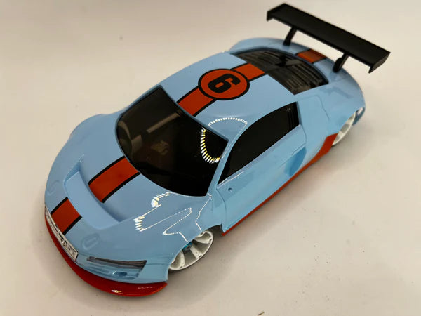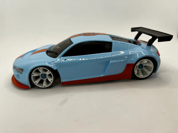 Mini-Z 98 mm body. Fits MR03, PN, or Mini-Z compatible chassis perfectly. Painted in a high gloss Gulf Livery, the Audi R8 is one of the best racing bodies and also looks amazing on the shelf. They come with an upgraded nano-diamond nose clip and are ready to glue on side clips for your own custom ride height preference.