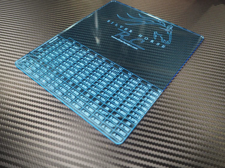 Our setup boards are perfect for checking your ride height or body clearance and are designed to fit perfectly with our custom-made pit mats! Built-in on the setup board is the gear ratio for standard pitch, 64 pitch, and 128 pitch gear ratios making gear choices much easier with this information readily available at your pit!