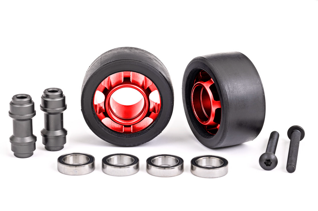 Machined from tough 6061-T6 aluminum and hard-anodized in brilliant eye-catching colors, these wheelie bar wheels are the perfect finishing touch for your ride. Durable soft-compound tires reduce side-to-side movement for stable, consistent wheelies. Four 10x15x4 mm bearings are used to reduce friction and increase precision. Includes axles (2) and screws (2). (Fits 7776, 8976, and 9576 wheelie bars)