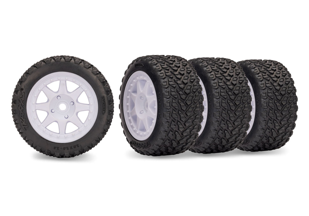 The Mini Rally tire set features two front (hard compound) and two rear (soft compound) tires. Mini Rally tires offer superior traction on pavement, dirt, gravel, and more with a unique directional tread pattern. Tires come pre-glued and mounted to white 8-spoke Rally wheels.