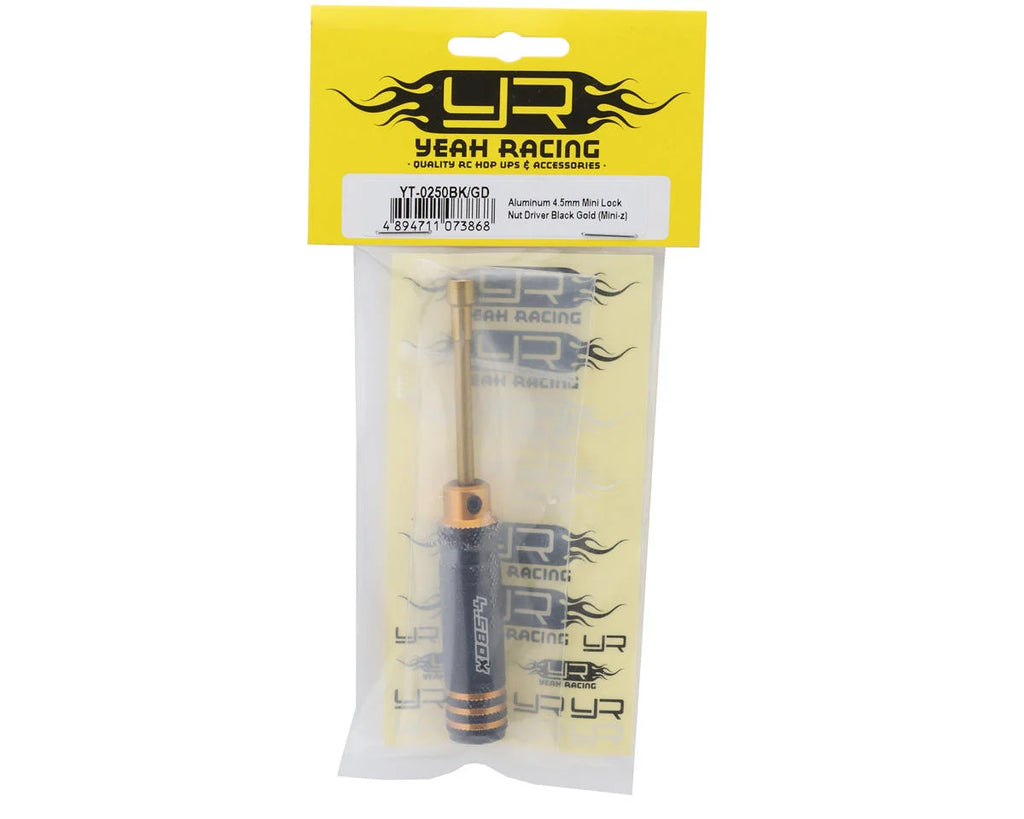 The Yeah Racing Aluminum Metric Lock Nut Drivers are perfect for building or repairing. Made from lightweight, durable aluminum and coated with Titanium Nitride for long-lasting performance, these drivers feature non-slip grips and easy-to-read size markings on the handles. With their black and gold anodized finish, they offer both style and reliability, making them a great addition to any pit toolbox.